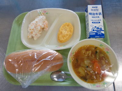 スライスコッペパン 牛乳 オムレツ フルーツクリーム カレースープ
