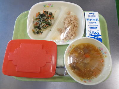 今日は児童の皆さんが好きな二色丼でした。また、豚汁にキムチを入れアレンジしたキムチ豚汁が登場しました。
