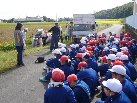 5年生が、『稲刈り』をしました。高斎さんに管理してもらいながら、5月に田植えをした苗は見事な稲穂になりました。5年生も協力しながら作業したり、黙々と自分の作業に取り組んだりと貴重な体験ができました。学んだことを総合学習に生かしてほしいです。 (担当:小野里)