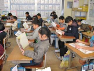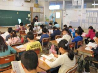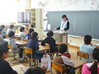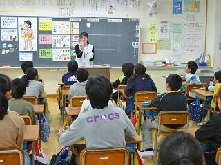 家庭科で学習した五大栄養素を確認しながら、給食メニューを分類したり、元気くんの献立に不足した物を加えたりという活動を行いました。野菜嫌いな子も多いせいか、一日分のビタミン(野菜)を見せられ、「こんなに食べられない」とつぶやいていましたが、三食に分けてとるといいことをアドバイスされていました。反省カードにも、もっと野菜を食べなければ・・・とか、多くの種類と働きを考えて食べていきたいと書かれていました。
