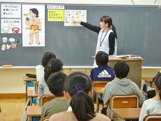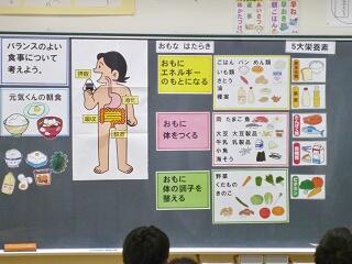 栄養教諭から食に関する指導をしていただきました。5大栄養素や食べ物の主な働きについて学習しました。バランスのよい食事について考えるよい機会となりました。