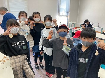 貝がらのキーホルダー作りは、いろいろな貝がらがあり、すぐに穴が開くものや大変なものがありますが、みんな熱心に取り組んでいました。思い出に残る手作りキーホルダーができあがりました。
