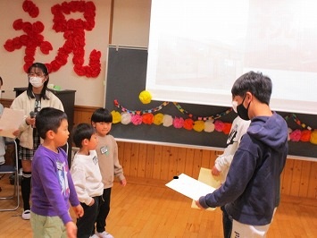 在校生からの心のこもったプレゼントを1年生が代表で贈呈しました。6年生からも美しいリコーダー演奏「カノン」と合唱「明日を信じて」をお礼の言葉とともにいただきました。