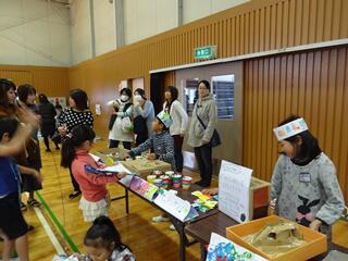体育館に、子ども達が作った旗が下がり、その下で12のお店屋さんの活動が展開されました。