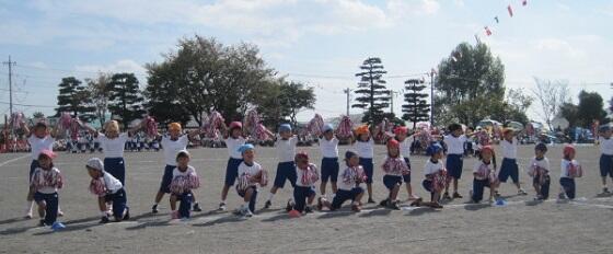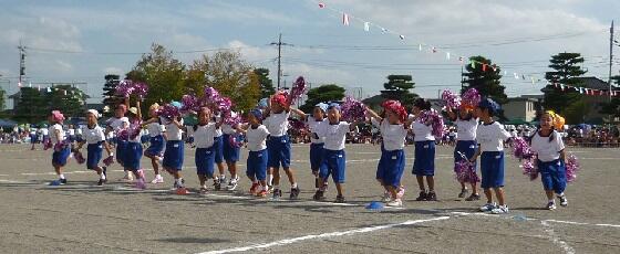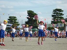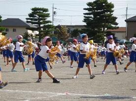 1・2年生は、“ゆず”の曲「イロトリドリ」に合わせて子どもたちがポンポンを持って可愛く元気に踊りました。振付もインターネットの動画サイトを参考にしながら、1年生と2年生の踊りのタイミングを変えたり、グループごとの踊りを入れたりと、途中にダンスの振り付けや隊形を工夫したので、覚えることが思ったよりも大変で難しく繰り返し練習をしました。曲の最後は、クラスごとの振り付けと“キメポーズ”を考え踊りました。本番では、曲に合わせてリズミカルに大きな動きを披露し、2年生はかっこよく、1年生は可愛らしさが表れたダンスになりました。子どもたちも、一番上手に踊れて大満足でした。