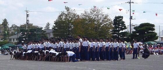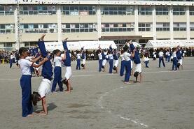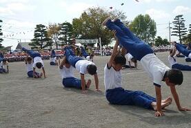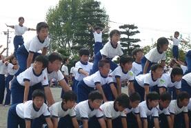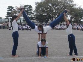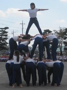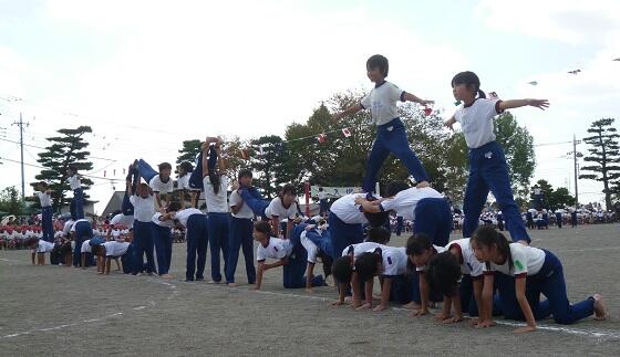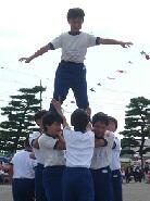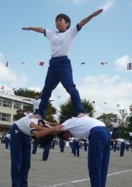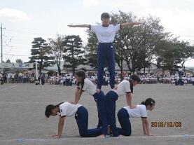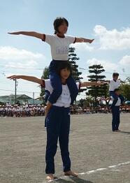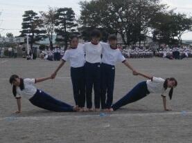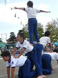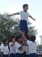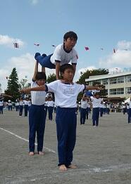 ピラミッドの次は、学年別の技です。6年生は今年初挑戦の「人間起こし」。起こされる子は、土台の子の肩に乗っています。恐怖心との戦いです。実際、本番数日前まで、上に乗る子の腰は引けてしまっていました。「土台は上の人を信じて支えている。絶対支えてくれるから、土台の人を信じて起き上がりなさい。」と声をかけ、当日はどのチームも堂々とした「人間起こし」を披露していました。