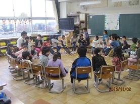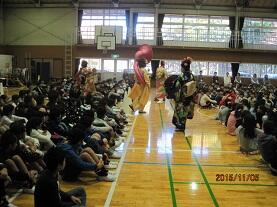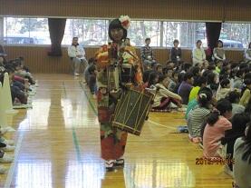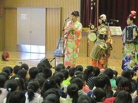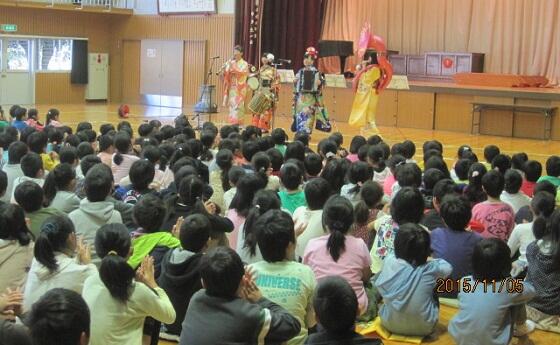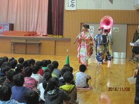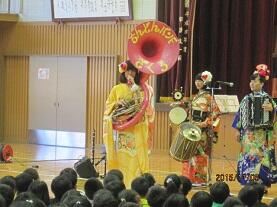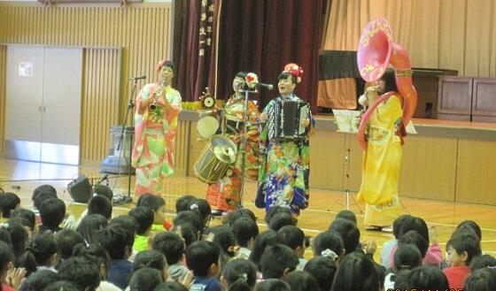 11月5日(木)の2校時に、さくら市教育委員会主催の「音楽鑑賞教室」が実施されました。今回は「ちんどんバンドコンサート」を企画していただき、演奏者は、打楽器+アコーディオン+クラリネット+スーザフォンによる「ちんどんバンドざくろ」の4人のメンバーです。華やかな和服に身を包んだメンバーが「聖者の行進」に合わせて登場すると、子ども達も手拍子を打ってちんどんバンドの雰囲気に誘い込まれ、あっと言う間の45分間で、素敵なひと時を味わうことができました。