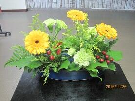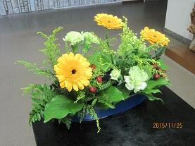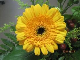 11月25日に、生け花ボランティアの方が見え、色鮮やかな黄色の「ガーベラ」と白い「カーネーション」の花、それに観葉植物の「ソリダコ」「レザーファン」と「レモンリーフ」、それから赤い実を付けた「ヒペリカム」を玄関に生けてくださいました。いつもいつも、ありがとうございます。