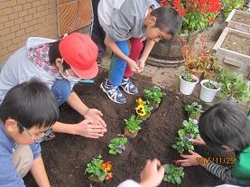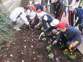 また、校舎前の各学年の花壇ではグリーン活動で「パンジー」の苗を移植する子ども達の姿がありました。明日の持久走大会のゴール付近を、色鮮やかなパンジーで飾ってくれました。
