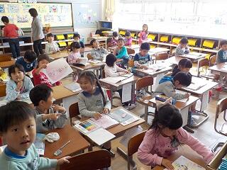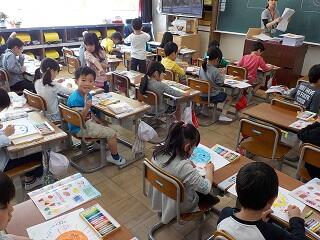 学年主任の三尾谷先生も、子どもたちの絵を「大絶賛!」です。思わず足を止めて、1年生の教室訪問となりました。何となく、得した気分です!