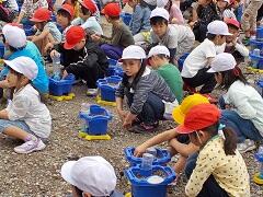 2年生が全員集合して、チューリップの球根を丁寧に笑顔を浮かべながら楽しそうに掘っていました。