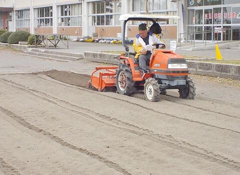 毎年、ヨシダファームの社長自ら、この時期になると市陸上競技大会に向けて子どもたちが練習を開始したことを聞きつけ、安全確保のために「砂場の整備ボランティア」を行ってくださいます。これで、安心・安全に南っ子が活動できます。「ありがとうございます。」