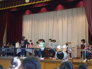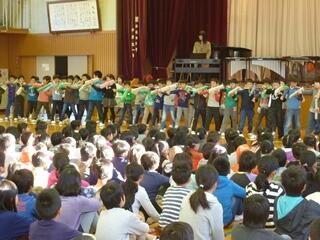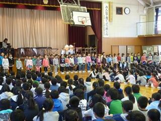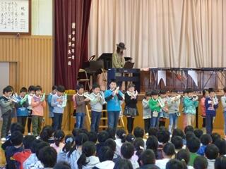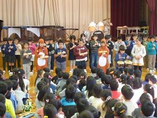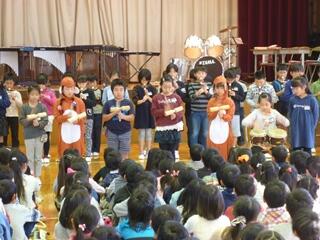 3年生は、4月から始めたリコーダーで合奏を行いました。1曲目は「おさるのマンボ」です。リコーダーに合わせて、ウッドブロックとボンゴのリズムを入れて発表しました。かわいいおさるも2匹登場して盛り上げてくれました。2曲目は、「ブラックホール」という曲です。デジタルCDのハイテク伴奏に合わせて、元気に演奏しました。 (担当:鈴木さ)