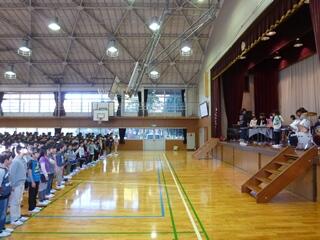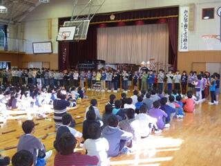 今回は、岡村孝子さんの「夢をあきらめないで」を全校生で合唱しました。お父さんお母さんの世代の方はよくご存じのヒット曲でした。最近はテレビのCMで使われているので子どもたちも知っていたようです。マッスルタイムの合間をぬって、バンドメンバーは、練習に励みました。秋の朝空のもと、南小の体育館には、さわやかな演奏とはつらつとした歌声が響いていました。