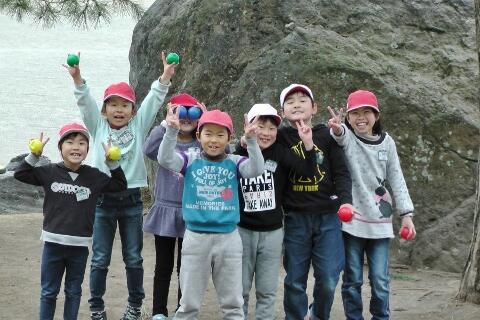 「はいポーズ!」カラフルなボールを持って、鬼ごっこ・・・南っ子は、やはり校庭での活動(外遊び)が似合います。元気キッズ大爆発の昼休みでした。