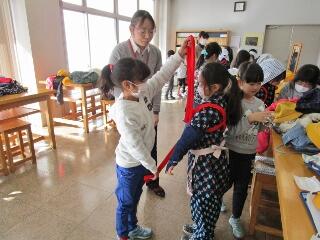 田植え着を着る体験をしたり、明かりの歴史や昔の道具について学んだりしました。