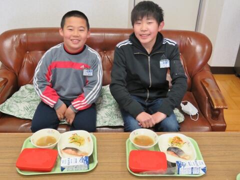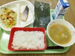 「給食のはじまり」今では当たり前に食べられる給食ですが、127年前の明治22年に、山形県の小学校で、貧しい子供を助けるための食事として出されたのが給食の始まりと言われています。それからだんだん生活が豊かになり、栄養のバランスを考えたり、安全で安心なものを出そうという給食へと変わってきました。今日は、給食が始まったころの献立を再現しました。「おにぎりと焼き魚、即席漬け」です。