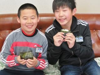 今日は、各自ビニール袋にごはんを入れておにぎりを握ってのりを巻いて食べました。