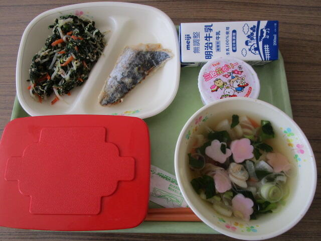 給食では、ハマグリのすまし汁、サワラの西京焼き、ひな祭りゼリー、3月3日の桃の節句を祝い「ひな祭り献立」をいただきました。