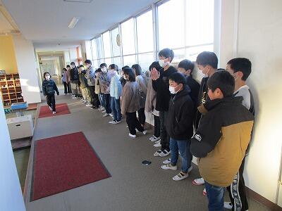 3月いっぱいで退職したり、他の学校に異動したりする教職員の方とのお別れの式です。今年度は8人の先生とお別れすることになります。校長先生からの紹介の後、お一人お一人からお話をいただきました。