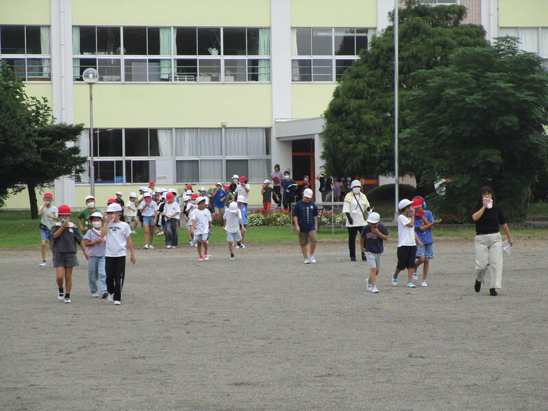 総合訓練のため、児童の訓練に加え、消防署の方からの避難状況や火災報知器に関する教職員への指導及び消防署への通報なども合わせて行いました。