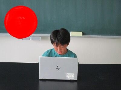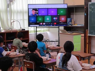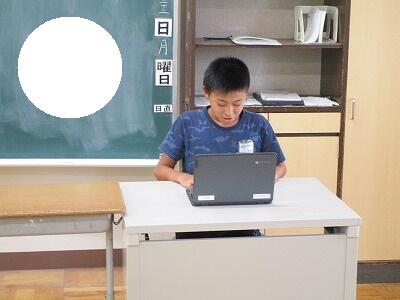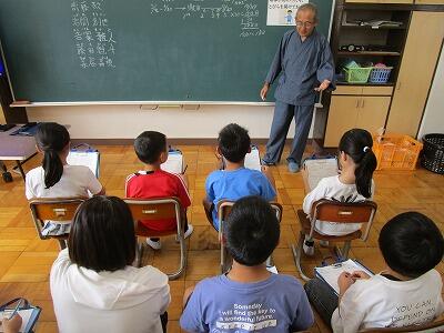 出題するのは5年生児童、回答するのは後ろの3人の先生(校長、教頭、担任)です。(撮影者が不在)