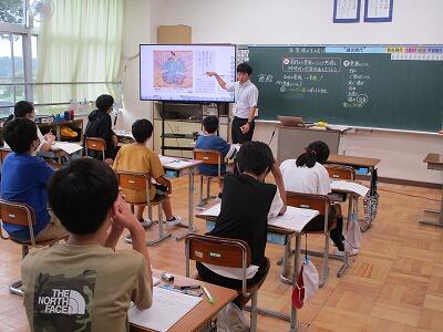 6年教室の様子:画面は世界中で起きた災害級の地震発生の場所の地図