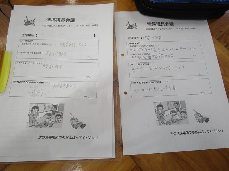 本校は旧1~3学期に合わせて、年3回清掃班が変わります。この夏休み明けで新たに清掃場所が変わるので、業間を利用して今年度2回目の清掃班長会議を実施しました。4月~9月までの自身の清掃場所の様子を振り返ること、次の班長にその内容を伝達することがねらいです。