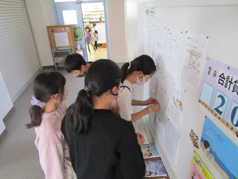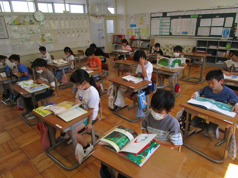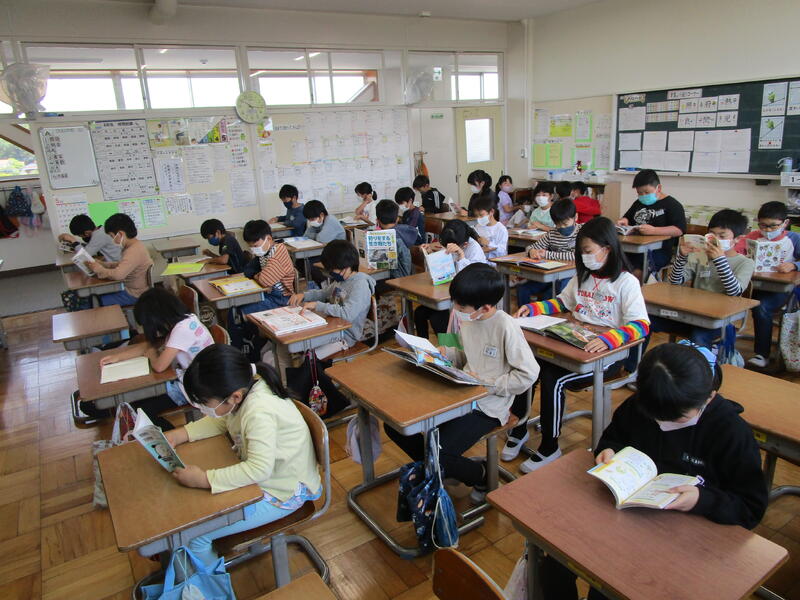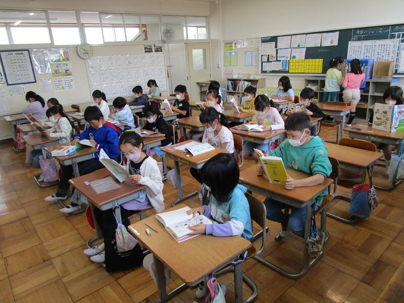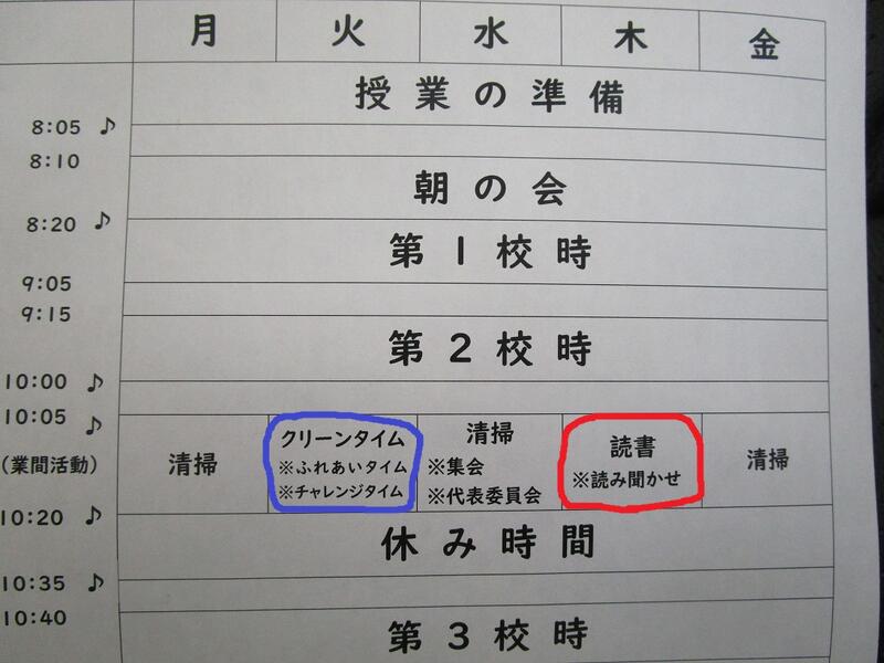 本校では、2校時と3校時の間の休み時間の前に、いろいろな活動を取り入れています。そのうちの一つが「読書の時間」です。写真(赤囲み)のように通常は木曜日ですが、児童の様子や行事等に合わせて、変更することがあります。今日(青囲み)は「読書の時間」を行ったので、その様子を掲載します。