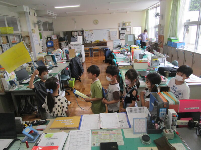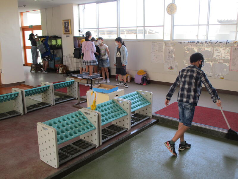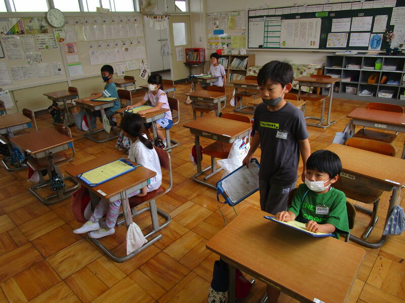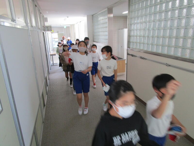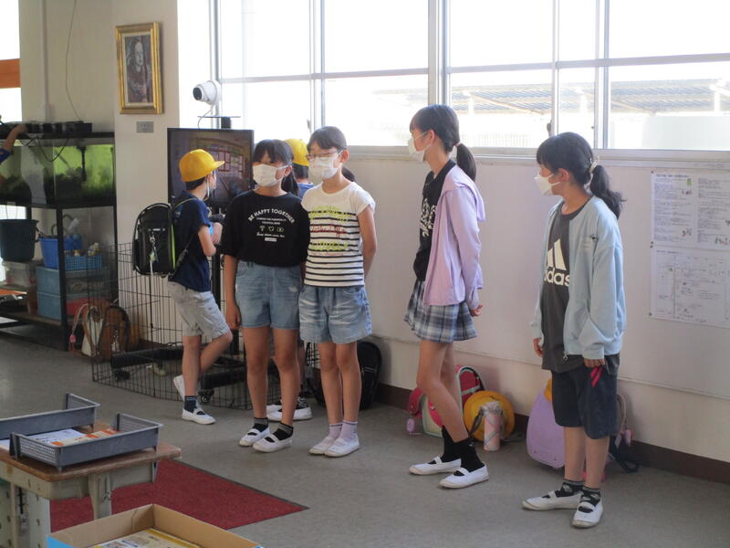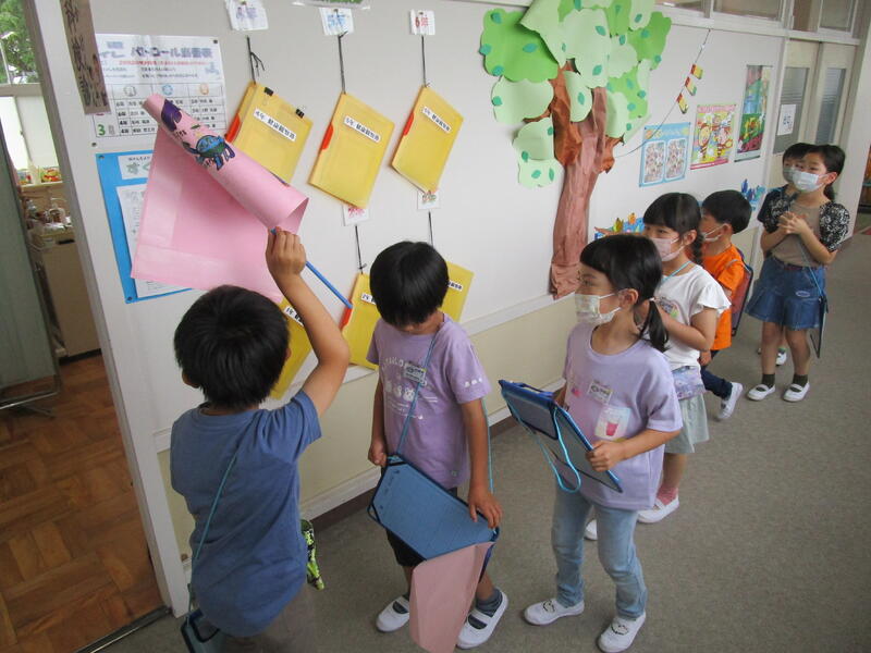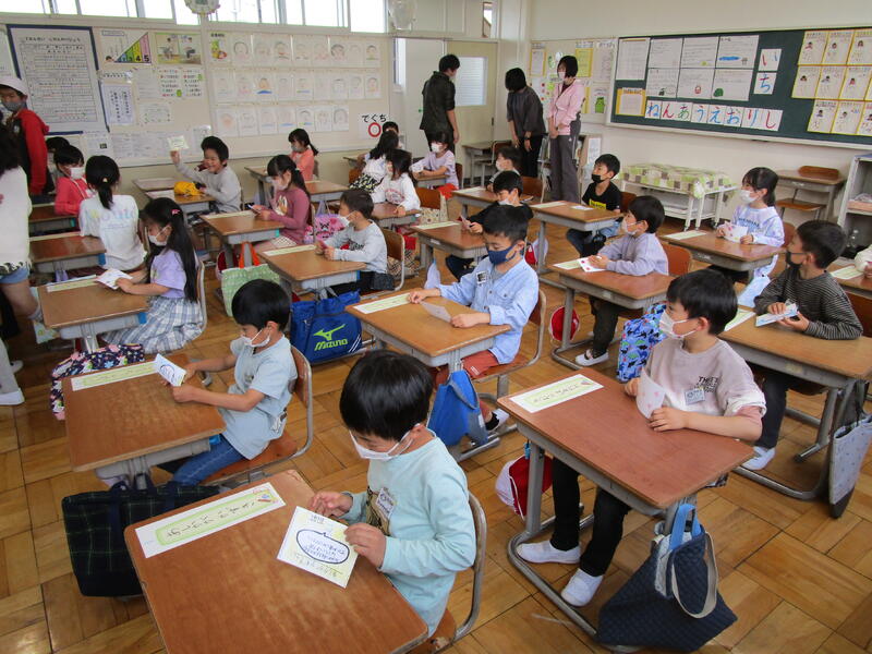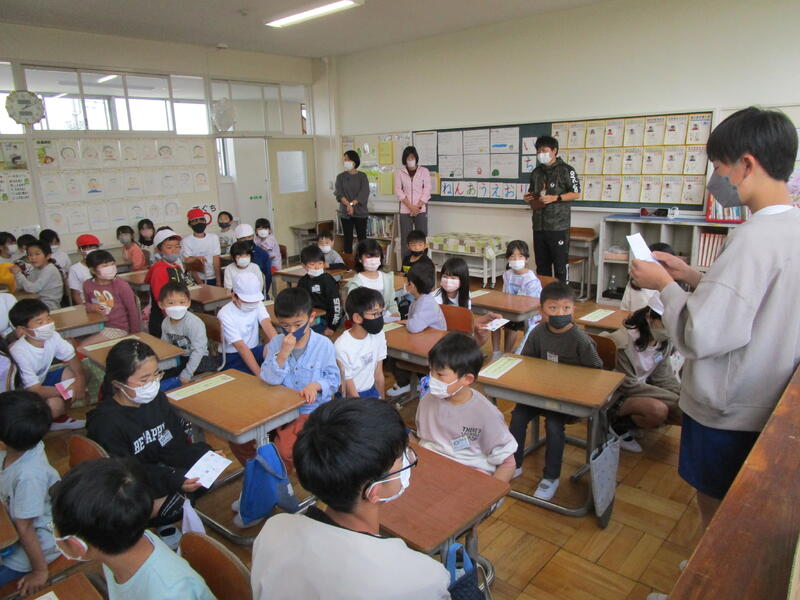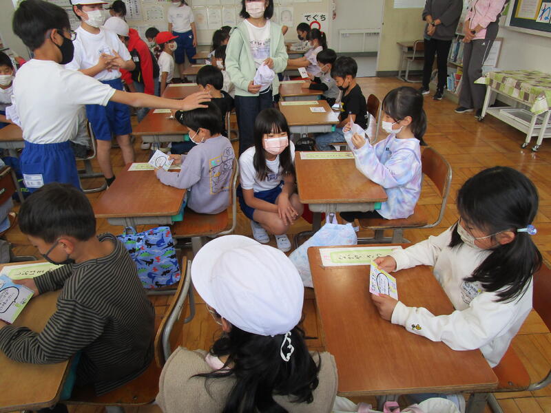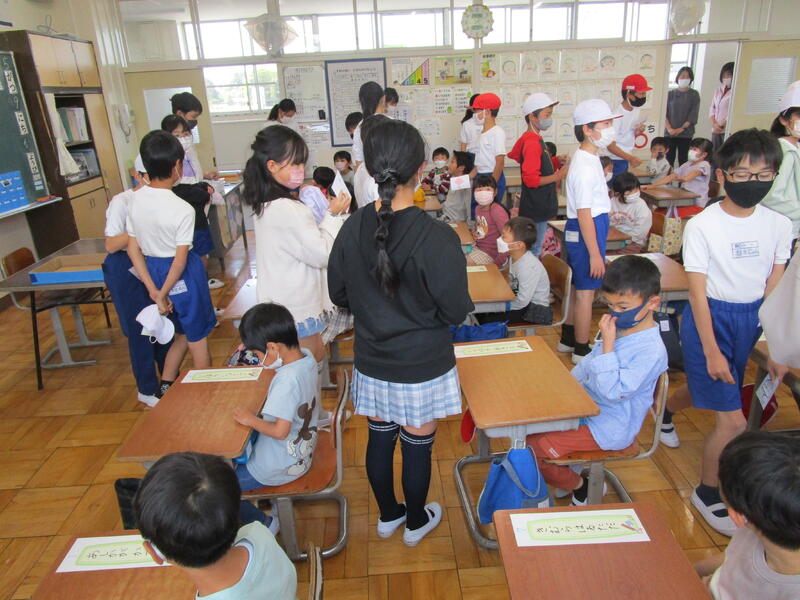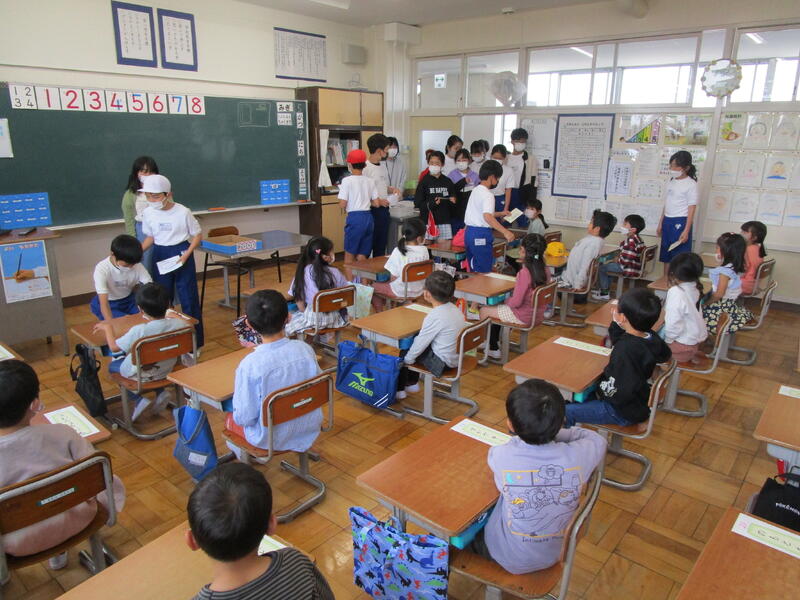 昼休みに、6年生と5年生(7名)が、明日5月10日(水)実施予定の「1年生を迎える会」の招待状を1年生に渡しに行きました。