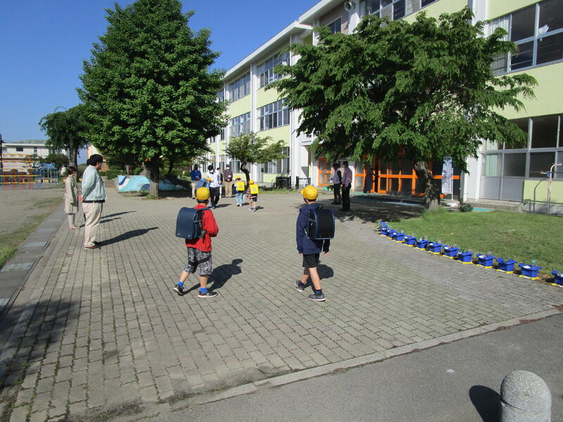 今朝、児童登校時は冷たい雨、強い風の荒れた天候でしたが、午前中に収まり、昼休みには晴れ間が見えました。