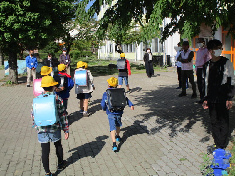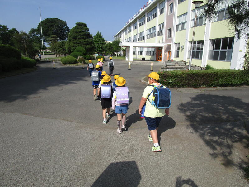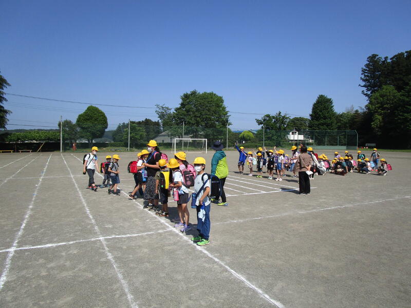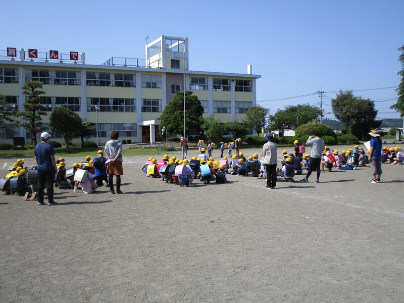 先生のお話を聞いた後、バスに向かいます。バスに乗車後、元気に手を振って出発しました。