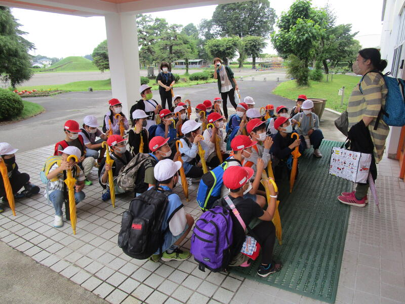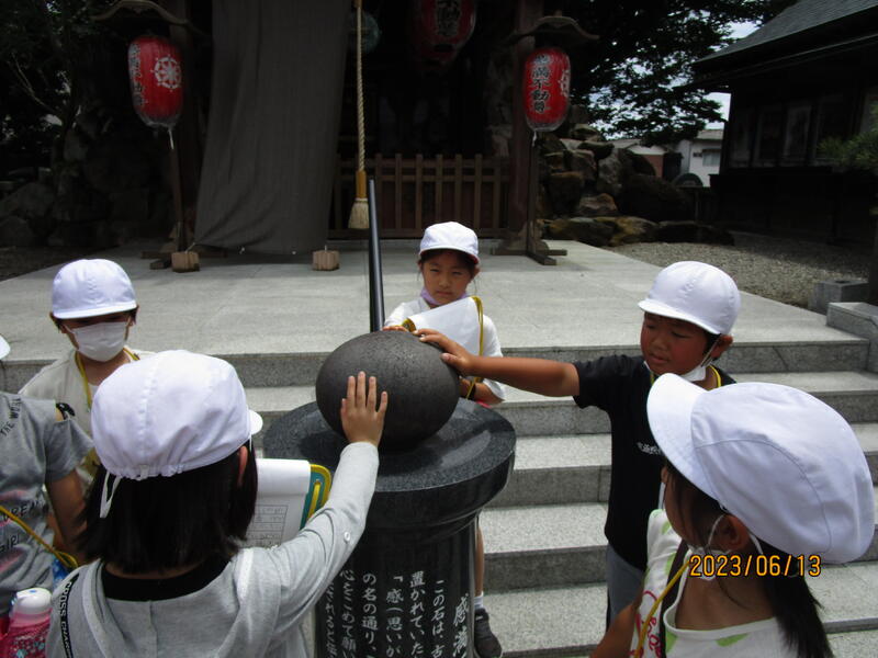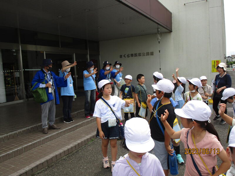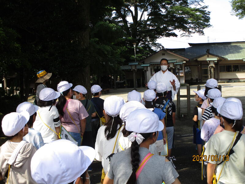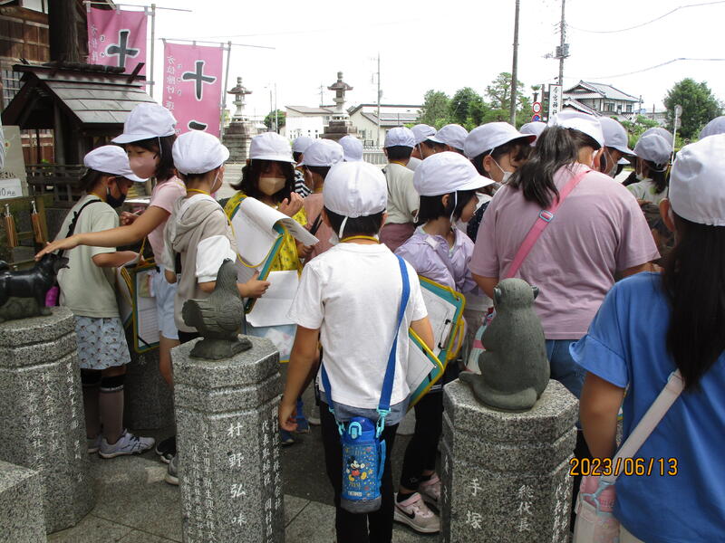 自分たちが住んでいる氏家地区の特色やよさに気付くとともに、興味をもった場所を選び調べていく学習の導入となります。ガイドボランティアの方の協力を得て、氏家地区を散策しました。