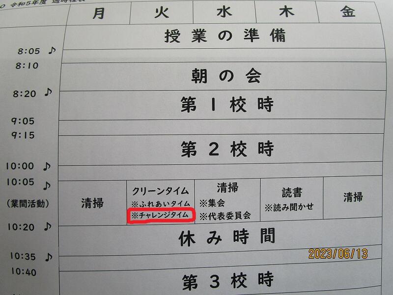 本校では、火曜日の2校時と3校時の間の休み時間の前(赤囲み)に月1回程度「チャレンジタイム」を設定しています。