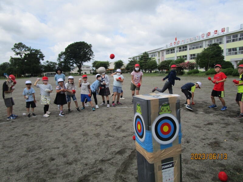 「チャレンジタイム」は、体力作りです。昨年度の新体力テスト結果から本校児童の課題を見出し、課題の向上を目指して作成した6種類(今日は昨日からの雨で不良箇所があるため「的当て」のみ)のトレーニングを順に行います。4,5月は準備期間にとし、本日6月13日(火)に初めての活動を行いました。