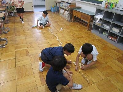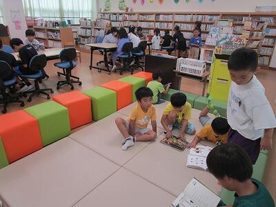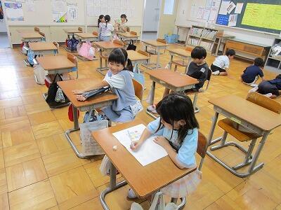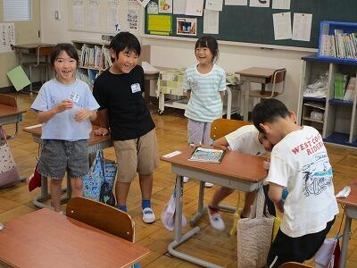台風の影響による降雨で、外で遊べない日の2校時休み。校舎内の様子を観察しました。