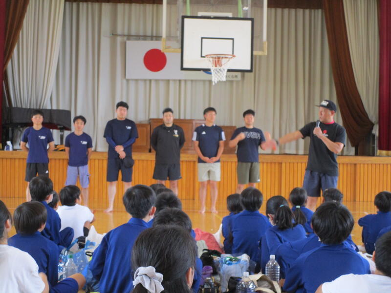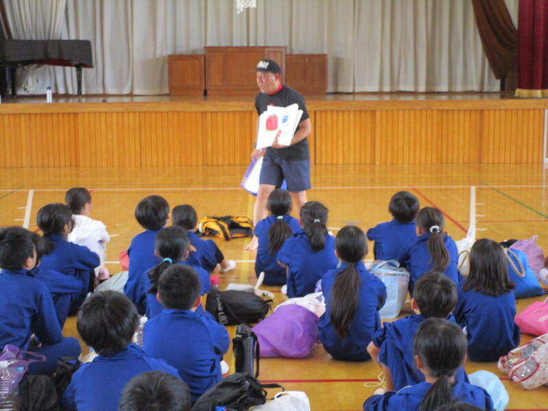 着衣状態での「浮きやすさ」を体験し、万が一、事故に遭ったときに「浮いて助けを待つことの大切さ」を学ぶ授業です。まず、体育館で講話を聞きました。