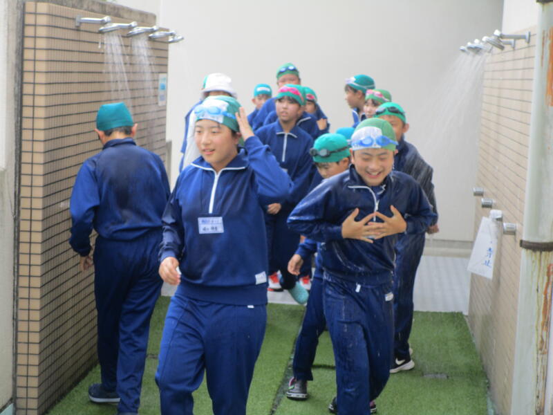 続いて体験講習です。まずは、シャワーを浴びます。「体育着でシャワー」不思議な光景です。