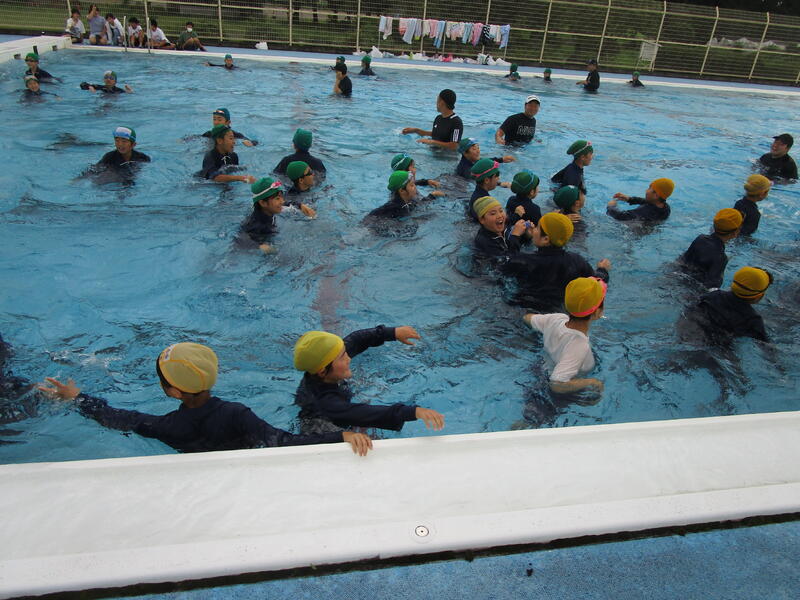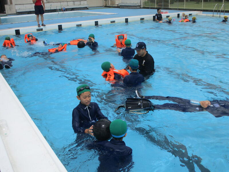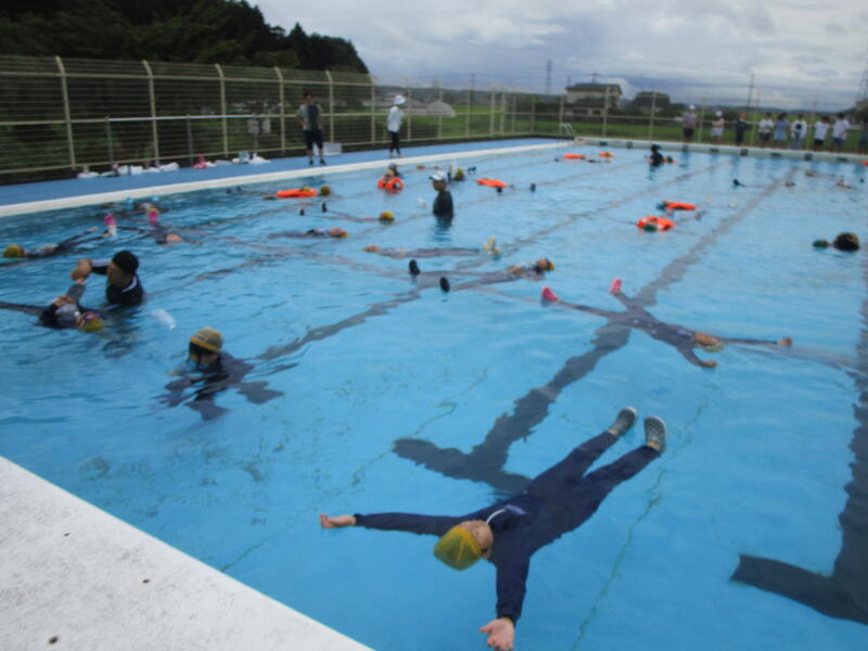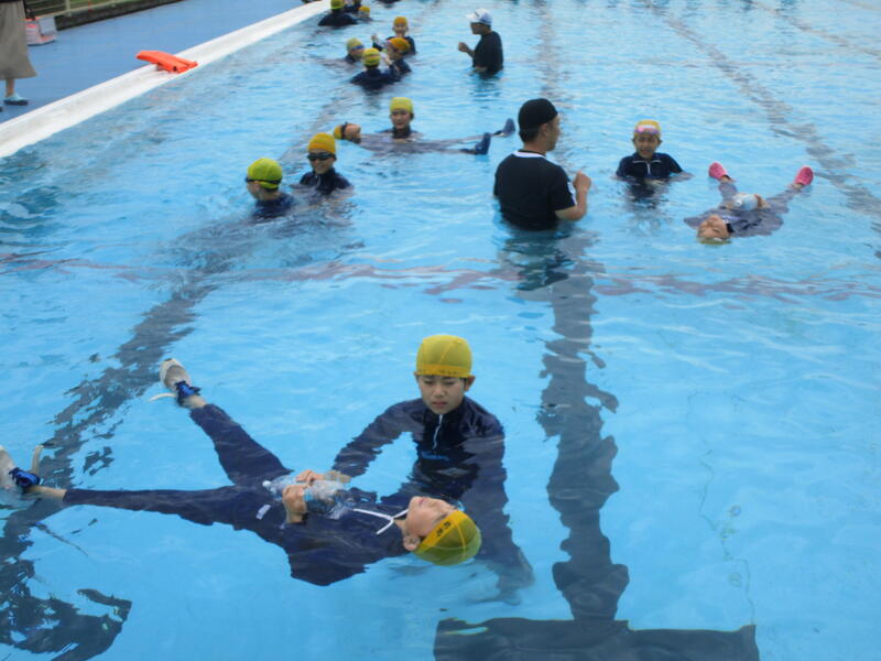 講話では、ヒトは何もしなければ、肺の働きにより「体の2%は水面から出る」ということ。「大声を出す」と肺内の空気が減るために、「手を上に伸ばす」と水面から出る2%が手になってしまうために、顔が沈み呼吸が確保できなくなること等を教わりました。
