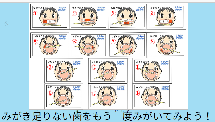 動画に合わせて歯をみがくことで、みがき残しがなくなることを目指します。