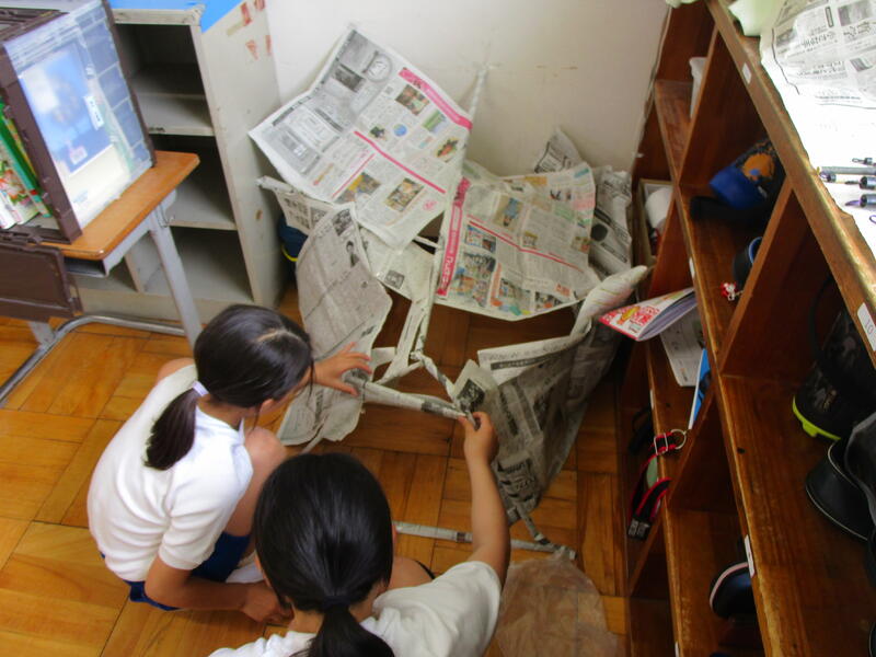 「棒状の新聞紙をつないだり組み合わせたりしてできた形や場所などの造形的なよさや面白さ、いろいろなつくり方などについて、感じ取ったり考えたりし、自分の見方や感じ方を広げる。」ことがめあてです。