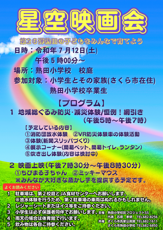 今年度も熟田小学校区プロジェクトSSの皆様が「星空映画会」を開催してくださいます。また、今年度は市制20周年記念行事として、さくら市総務課(危機管理係)のご支援のもと「地域総ぐるみ防災・減災体験」も行われます。もちろん、毎年恒例の「みんなで綱引き」も実施されます。