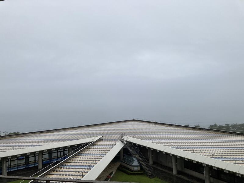 「おはようございます」2日目の朝です。施設から見た海は⤵の感じ、どんよりの雨模様です。