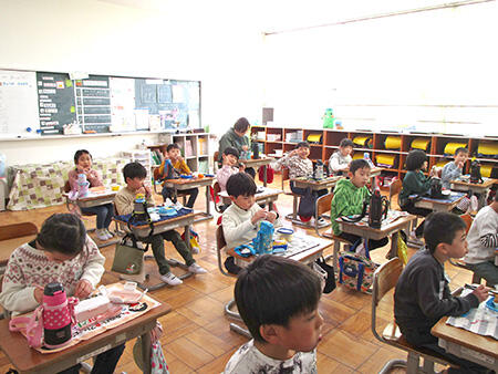 2階教室(1,2,6年生)の朝の会の「朝の歌」の様子です。