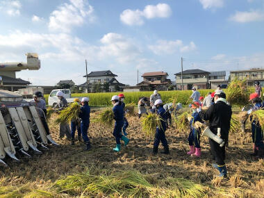 5年生が総合的な学習の時間の一環として稲刈りを実施しました。とてもよい秋晴れの中、汗を流しながら一生懸命に刈ることができました。刈った稲はすぐさまコンバインで脱穀し、作業が終わった後は全員が笑顔になりました。