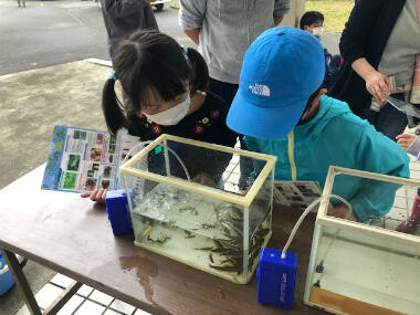 16日午前中、挾間田地域環境保全協議会主催による生き物調査が開催され、十数名の小学生と保護者及び保全会の皆さんが参加し、和気藹々と調査活動を行いました。大きな網やタモを上手に使い、ザリガニやカワムツなどの小魚、タイコウチなどの昆虫を採取しました。学校に戻ってからは専門の先生より生態の様子や由来などの説明を聞き、子ども達も感心しながら耳を傾けていました。