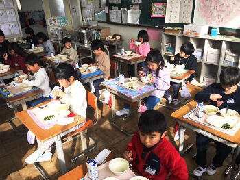 4年生の教室を訪問しました。会話なく黙々と食べています。しゃけの塩焼きは箸が進まない子もいたようです。「がんばれ」と心の中で声援を送りました。