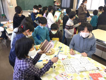 2月実施予定の6年生を送る会に向けて、1年生が輪飾りづくりをしています。折り紙を4つに折り、折り目通りに切るところからスタートしています。さて、上手に作れるでしょうか。楽しそうに作業していました。