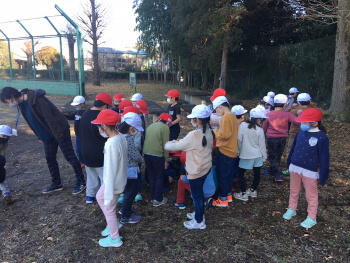 生活科の学習で、熟田小学校の冬探しをしています。敷地内を散策しながら、みんなで冬らしい”モノ”を見つけていました。