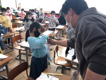 春を思わせる晴天の中、6年生を送る会を実施しました。例年は体育館で行っていましたが今回は野外です。縦割りのグループになってゲームをしたり、プレゼントを渡したりしました。短い時間でしたが楽しい活動になりました。企画運営を担当した5年生もしっかりとやり抜くことができました。